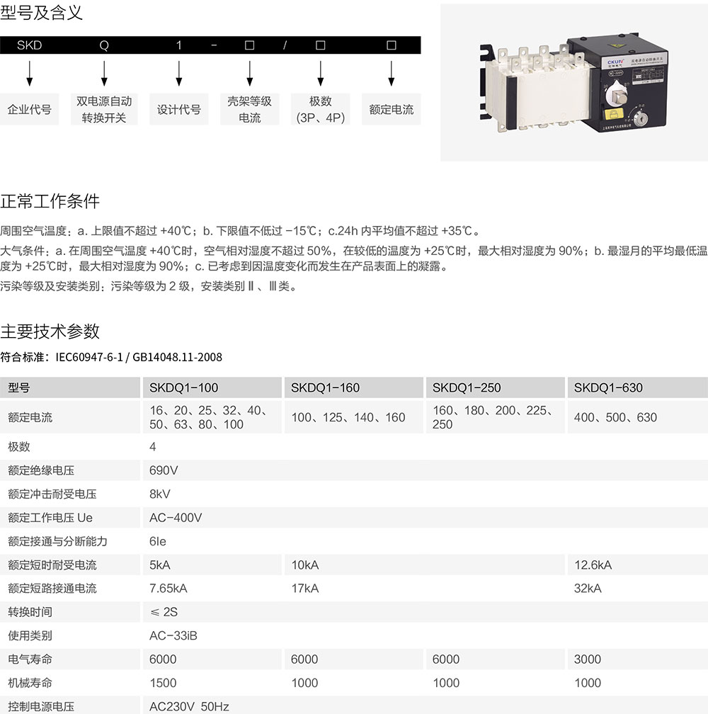 SKDQ1(PC 級)系列隔離型雙電源自動轉(zhuǎn)換開關(guān)具有較強(qiáng)的介電性能、防護(hù)能力和可靠的操作安全性。開關(guān)適用于供電系統(tǒng)的主電源與備用電源之間自動轉(zhuǎn)換或兩臺負(fù)載設(shè)備的自動轉(zhuǎn)換及安全隔離等。開關(guān)造型美觀、新穎、簡潔、體積小、功能全,是不同場合的理想選擇。