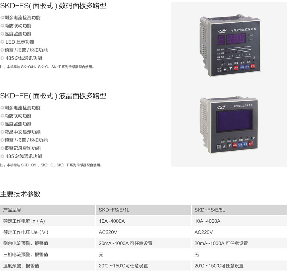 SKD-FS/E系列剩余電流式電氣火災(zāi)監(jiān)控探測(cè)器集過(guò)電流、剩余電流、溫度的檢測(cè)、預(yù)警、報(bào)警、消防聯(lián)動(dòng)及通訊等多種功能于一體,適用于三相四線制380V及單相制220V及單相制220V的電氣線路中,產(chǎn)品具有智能化分析能力的新型防火設(shè)備。當(dāng)供電設(shè)備發(fā)生電氣事故時(shí),探測(cè)控制器能發(fā)生報(bào)警聲及時(shí)提醒工作人員檢查故障,排除可能發(fā)生的電氣隱患,防止事故發(fā)生。