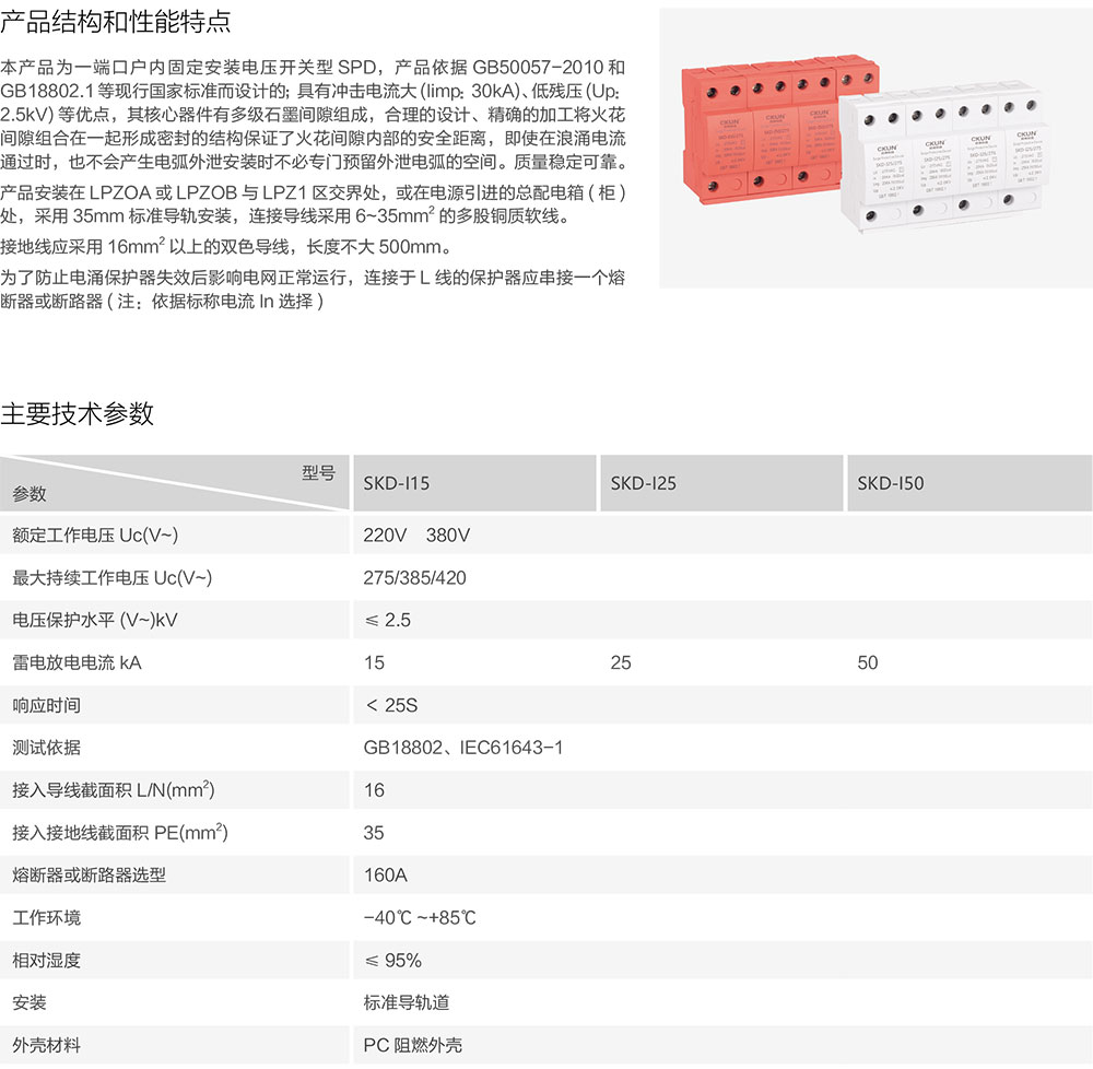 SKD-A15/A25/A50(10/350us)雷擊電涌保護(hù)器(以下簡稱SPD)適用于交流50/60Hz、380V以及下的TT、TN等供電系統(tǒng),對(duì)雷擊或其它瞬時(shí)過電壓進(jìn)行保護(hù),應(yīng)用于雷擊風(fēng)險(xiǎn)較高地區(qū)的電源系統(tǒng)的一級(jí)(B級(jí))防雷保護(hù),安裝在LPZ0B區(qū)與LPZ1區(qū)交界處各項(xiàng)技術(shù)指標(biāo)均滿足現(xiàn)行的GB50057-2010和GB18802.1 中規(guī)定的要求。